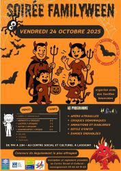 Le centre Social et Culturel de Lassigny organise avec l'aide de familles bénévoles en date du 24 octobre 2025 une soirée Familyween à partir de 19h00 et jusqu'à 23h00.