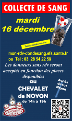 L'Association des Donneurs de Sang Bénévoles de Noyon et sa région organise une collecte de sang le mardi 16 décembre 2025 à Noyon au Chevalet de 14h00 à 19h00.